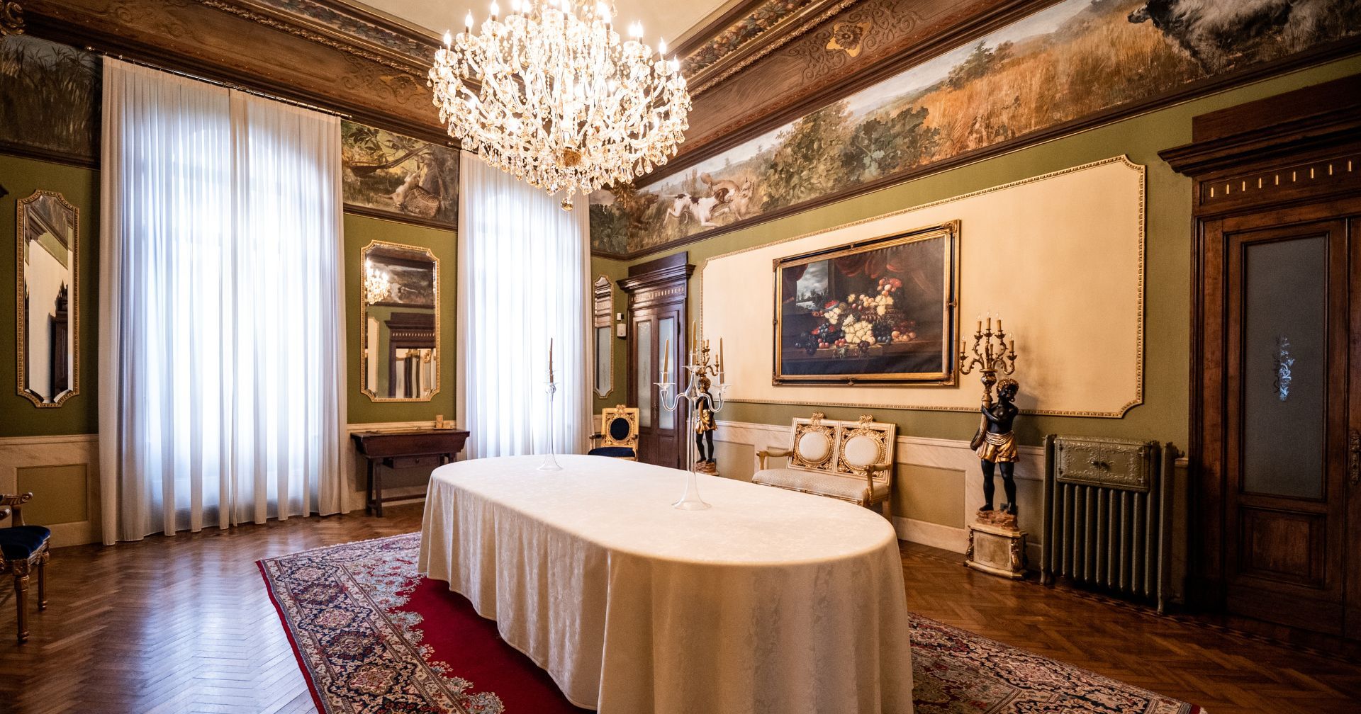 All'inteno della Villa si trovano la reception, il Salone principale in stile liberty, la suggestiva Sala della Caccia, una saletta in stile veneziano e un piccolo bar.